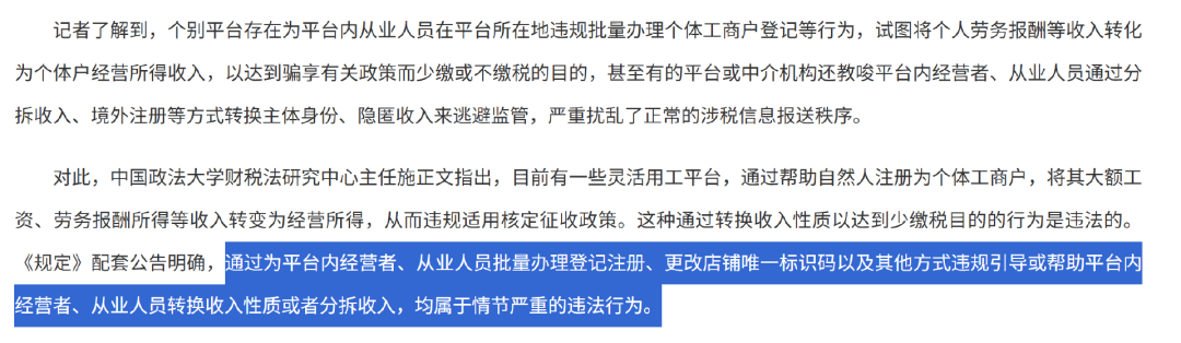 与此同时,在披露涉税信息报送进展的媒体报道中,相关操作也遭到了税务局点名。该报道指出,个别平台或中介机构存在教唆平台内经营者、从业人员通过分拆收入、境外注册等方式转换主体身份、隐匿收入来逃避监管的行为,严重扰乱了正常的涉税信息报送秩序。