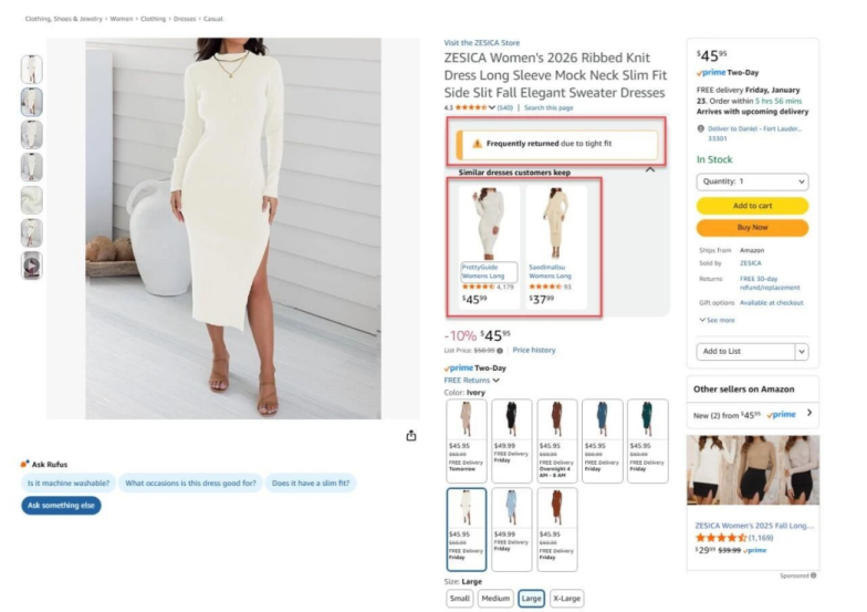 以女装品类为例,当商品标注 “Frequently Returned” 且退货原因为 “tight fit”(版型偏紧)时,买家可结合主图区的消费者提问互动,买家可快速预判购买后退货概率,进而放弃下单。