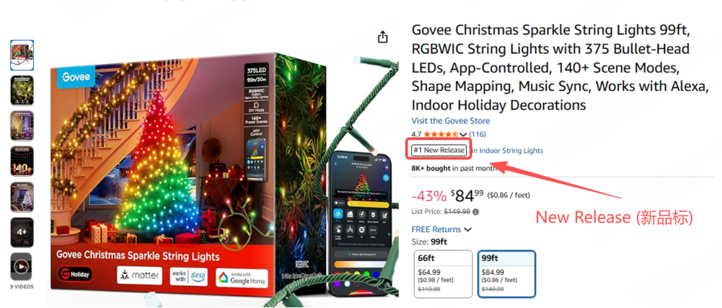 亚马逊传统「New Release」标签:针对上架 90 天内、销量增速突出的新品,是平台核心新品扶持政策,加持更高自然排名权重。